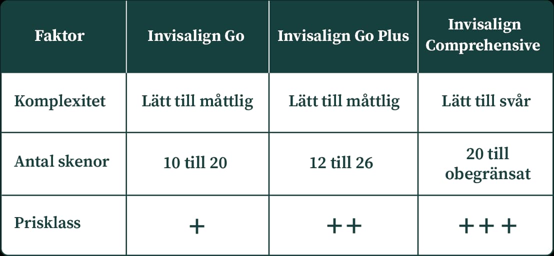 • Jämförelse av Invisalign Go, Go Plus och Comprehensive hjälper dig att förstå vilket system som passar bäst för din tandkorrigering.
